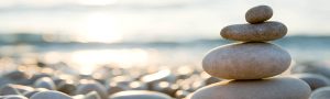 Balanced stones on a pebble beach during sunset.